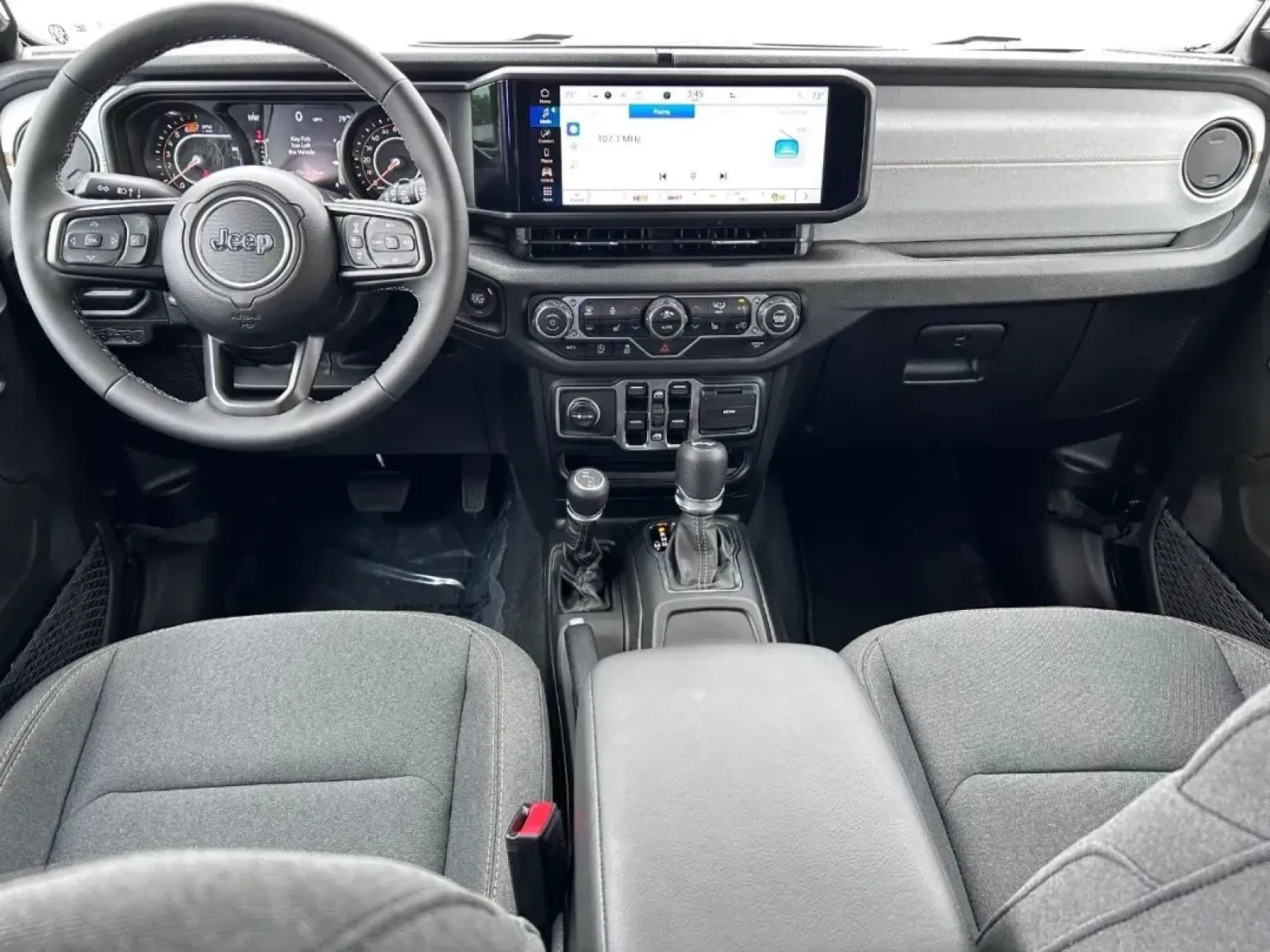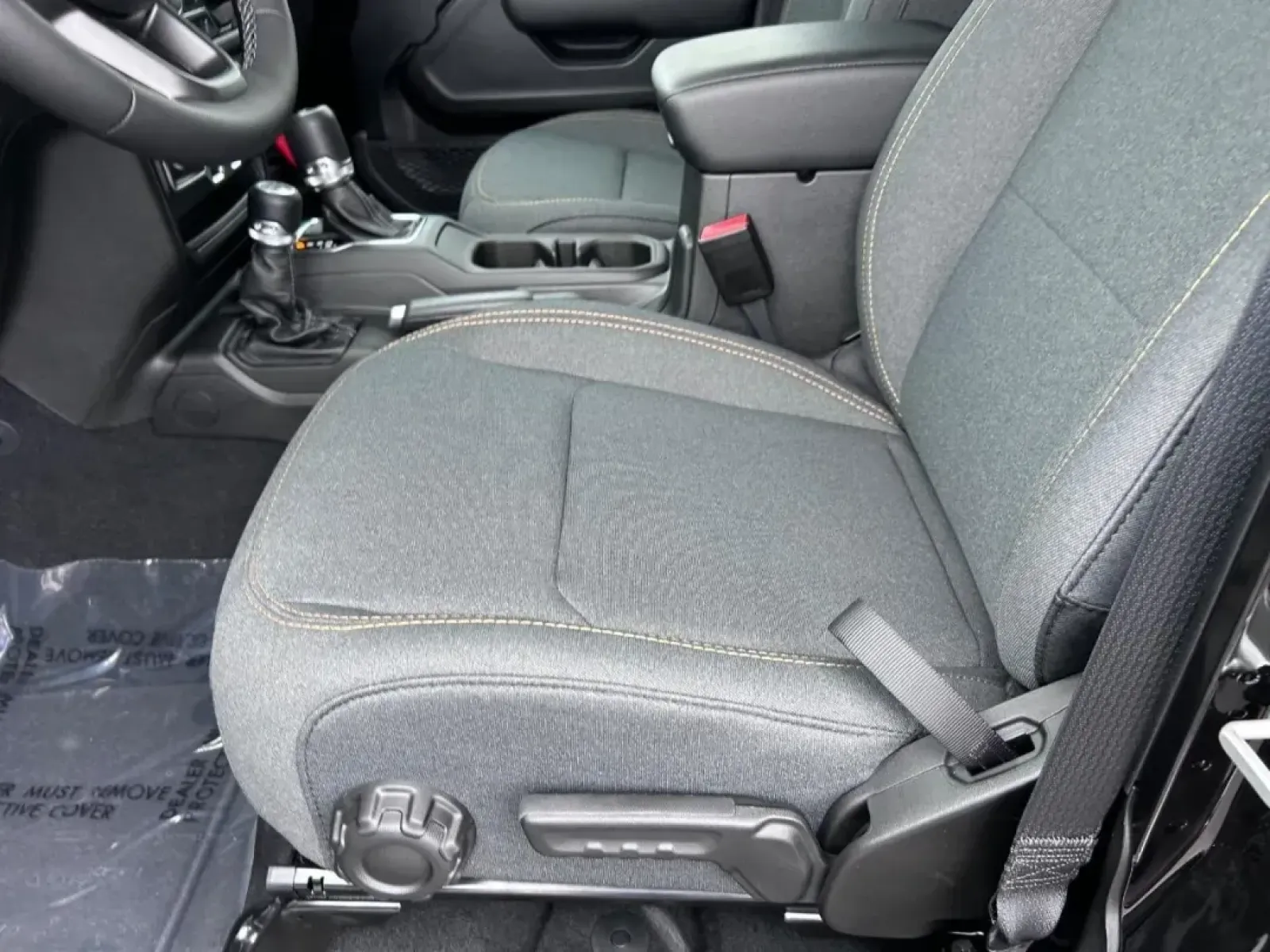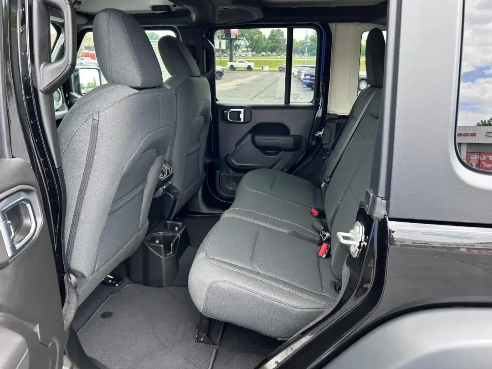 Inside, the Wrangler is equipped with comfort and convenience features that make both short commutes and long journeys enjoyable. The black cloth interior is not just stylish but also easy to maintain. You'll find adjustable bucket seats, a spacious rear bench seat, and child safety locks, making it safe and comfortable for passengers of all ages. The SUV is also designed with modern tech features, including Bluetooth connectivity, an AM/FM stereo, and a backup camera, ensuring you're always connected and aware of your surroundings.